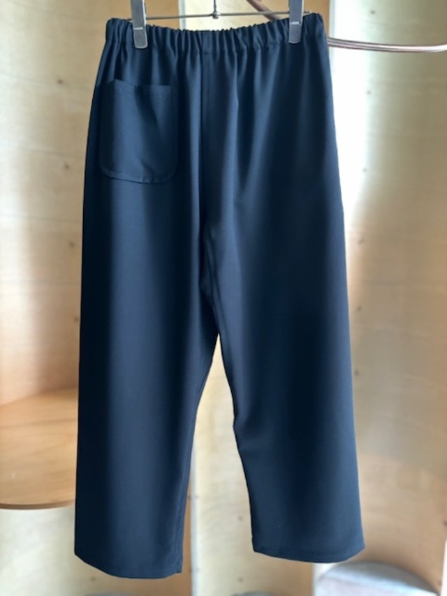 TC-P104 黒 ウール100% S:ウエスト66cm、総丈(脇丈)91cm M:ウエスト70cm、総丈(脇丈)94cm 高密度で織られたウールギャバ素材を使用した定番パンツ。 スーツなどで使用されるウールギャバは美しい光沢感とソフトな素材感が特徴。 前後に配したパッチポケットがアクセントになりゆったりとしたシルエット。 ウエストはゴム仕様、内側にドローコードを配しており、サイズ調節が可能。デザイン性と履き心地を兼ね備えた一着です。