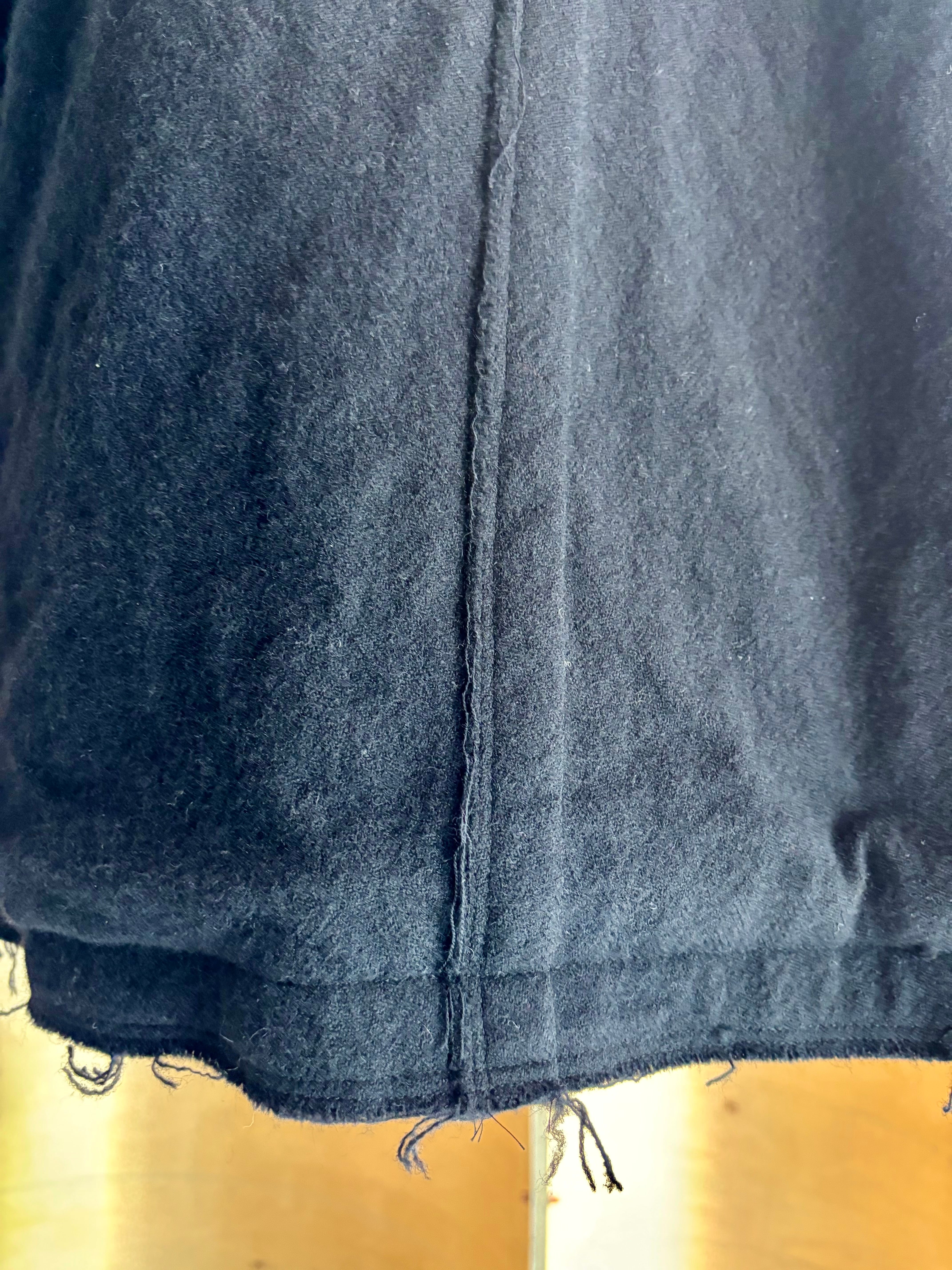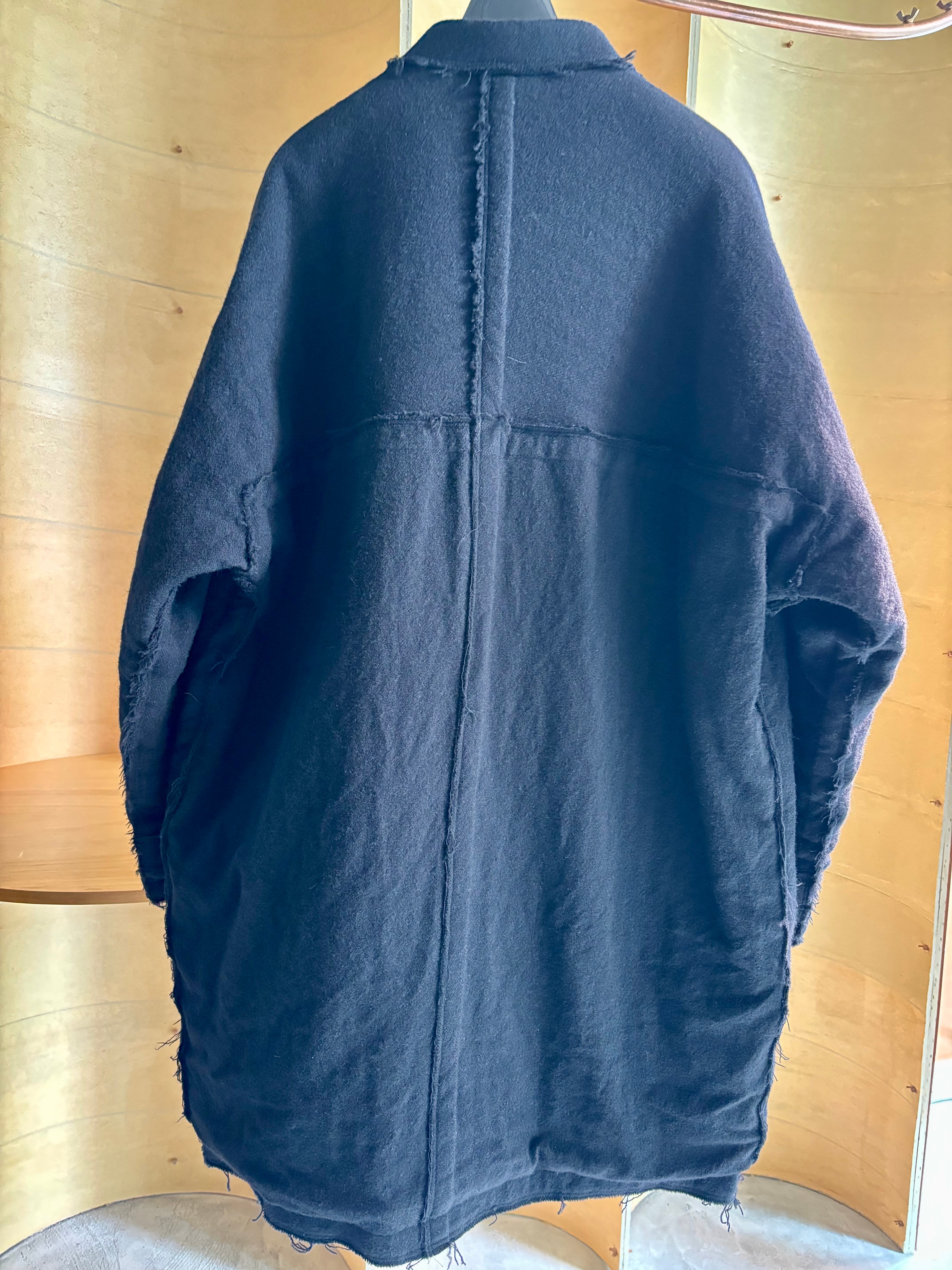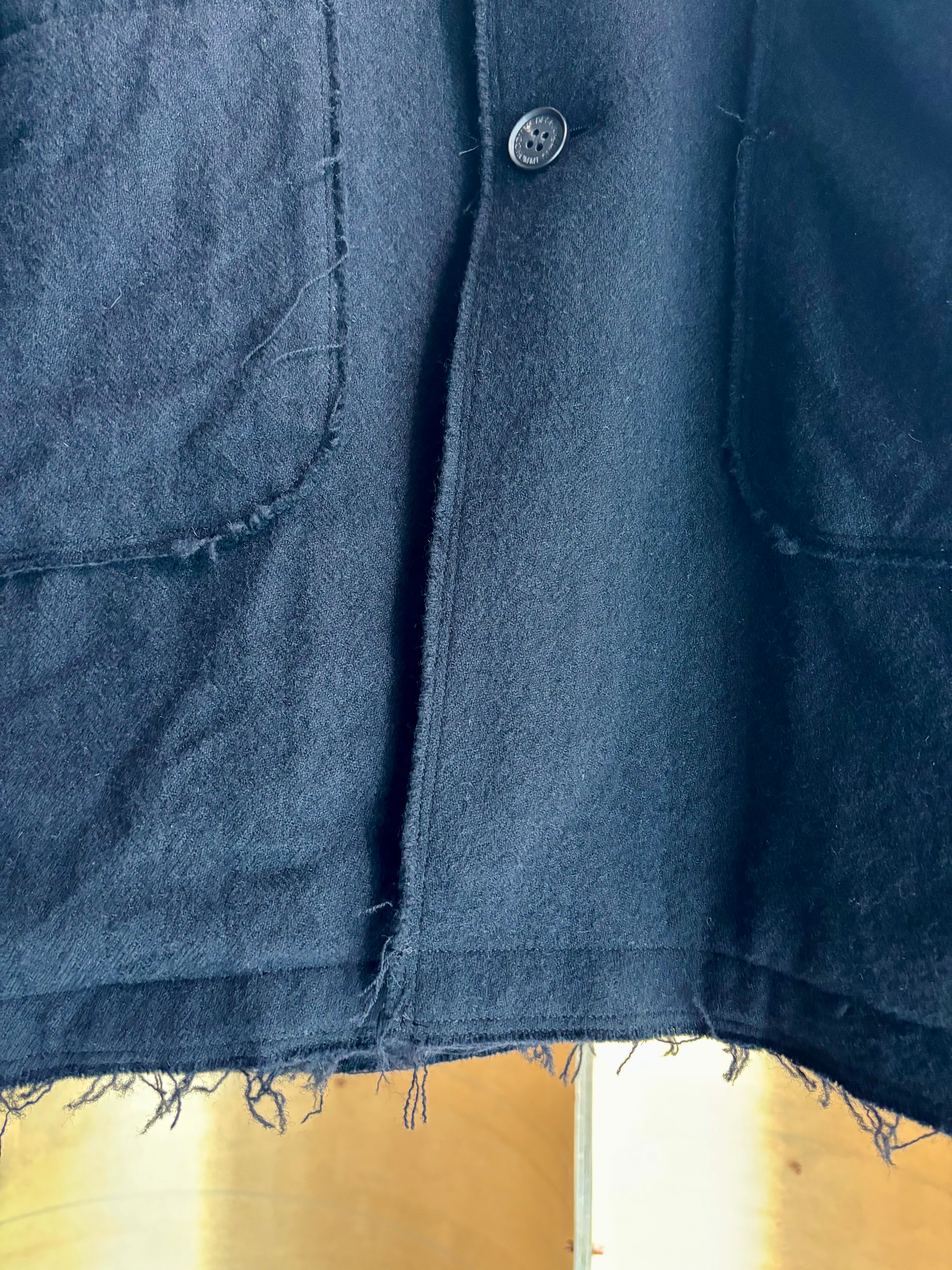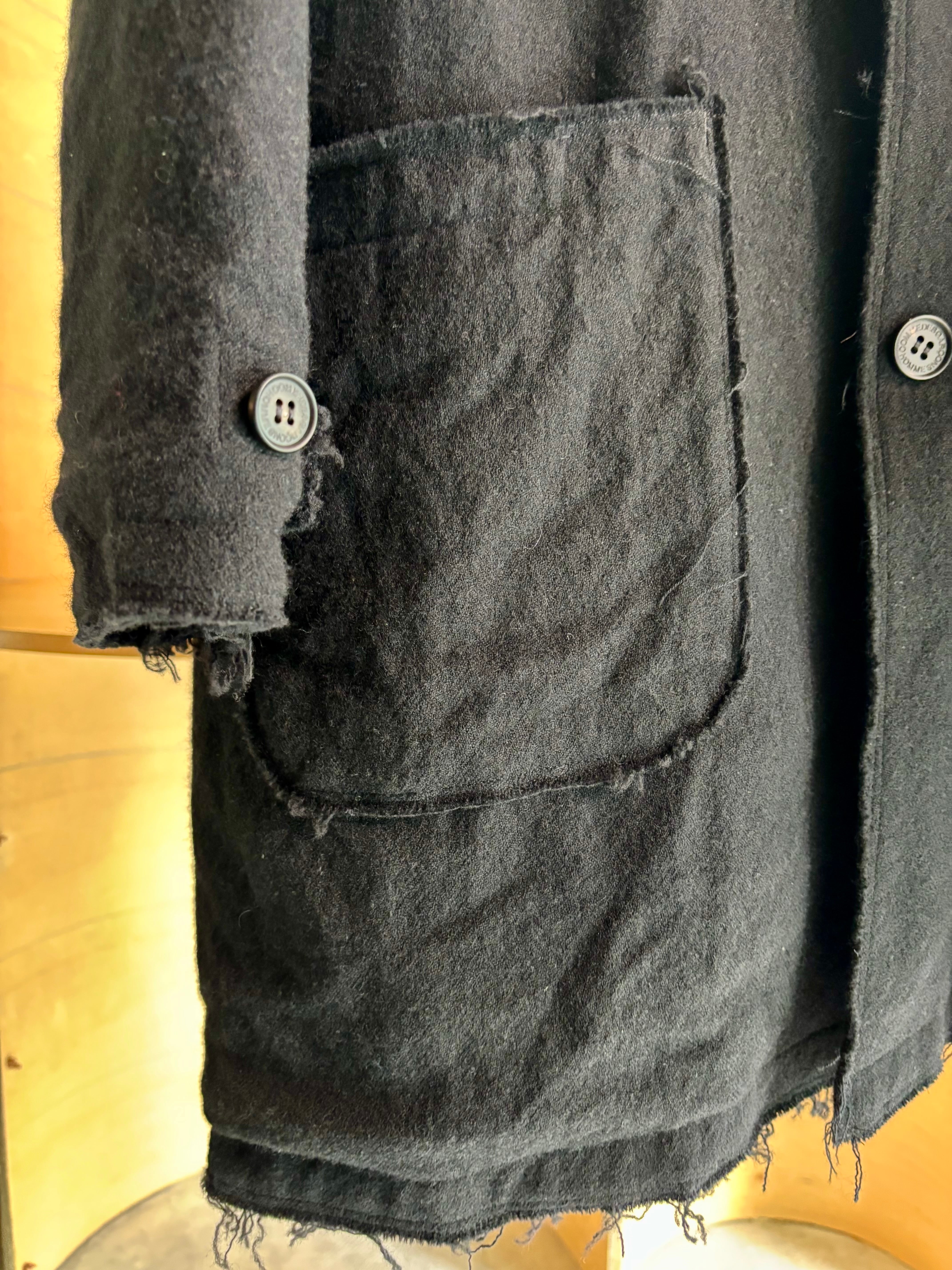 このコートは、切りっぱなし製品加工が施され、独特の風合いが魅力です。ラフながらも洗練された印象を与え、さまざまなスタイルにマッチします。