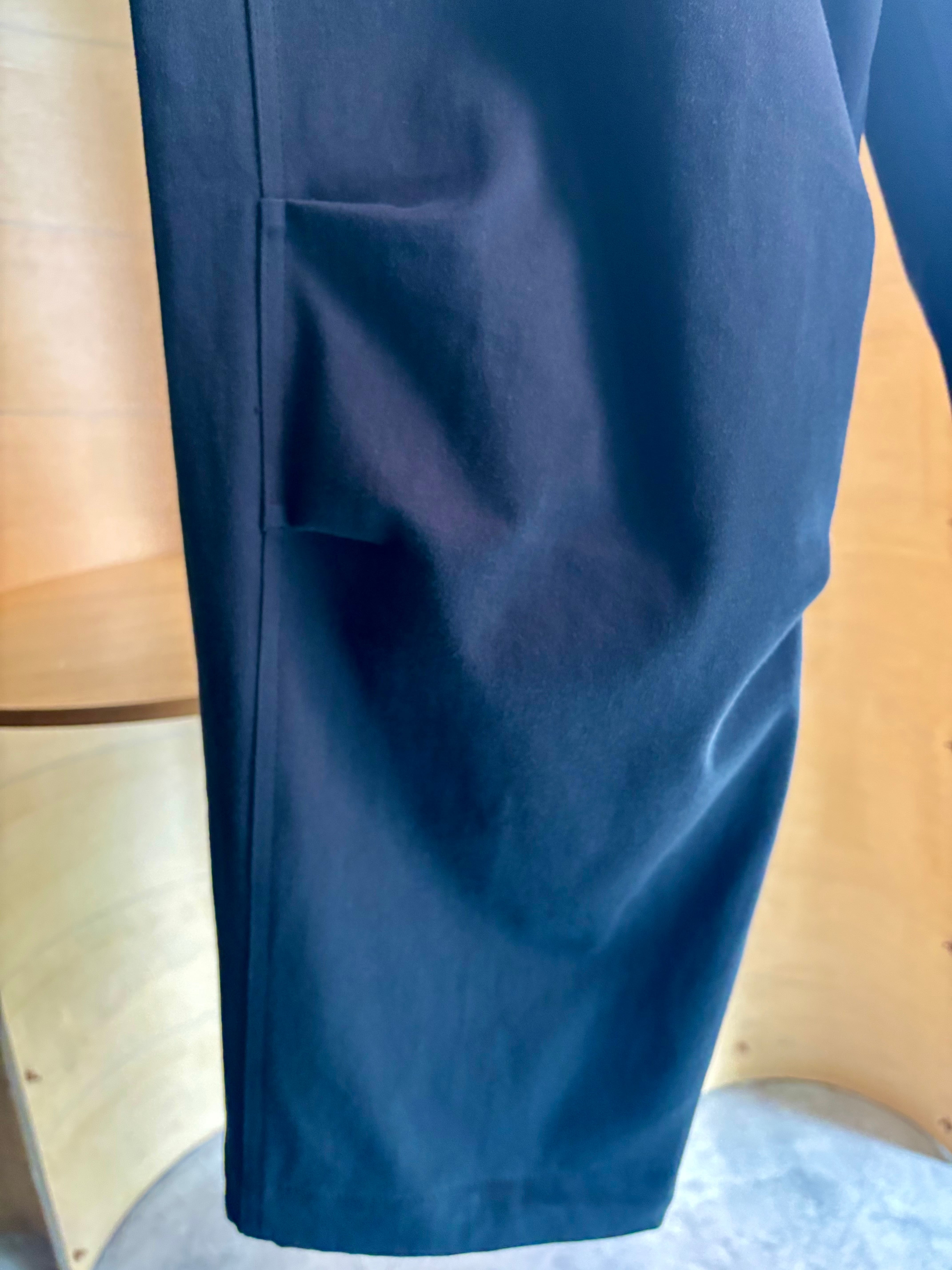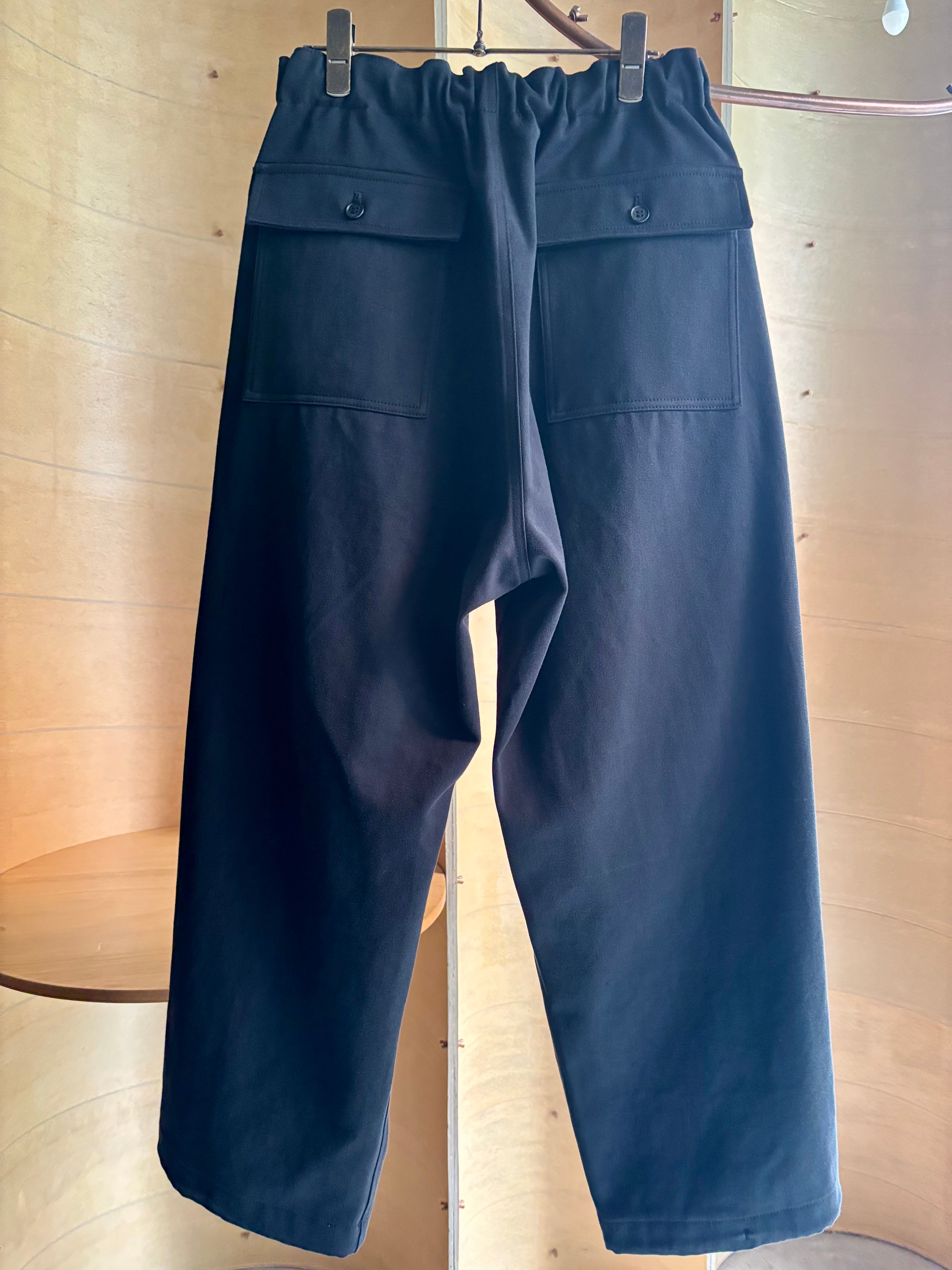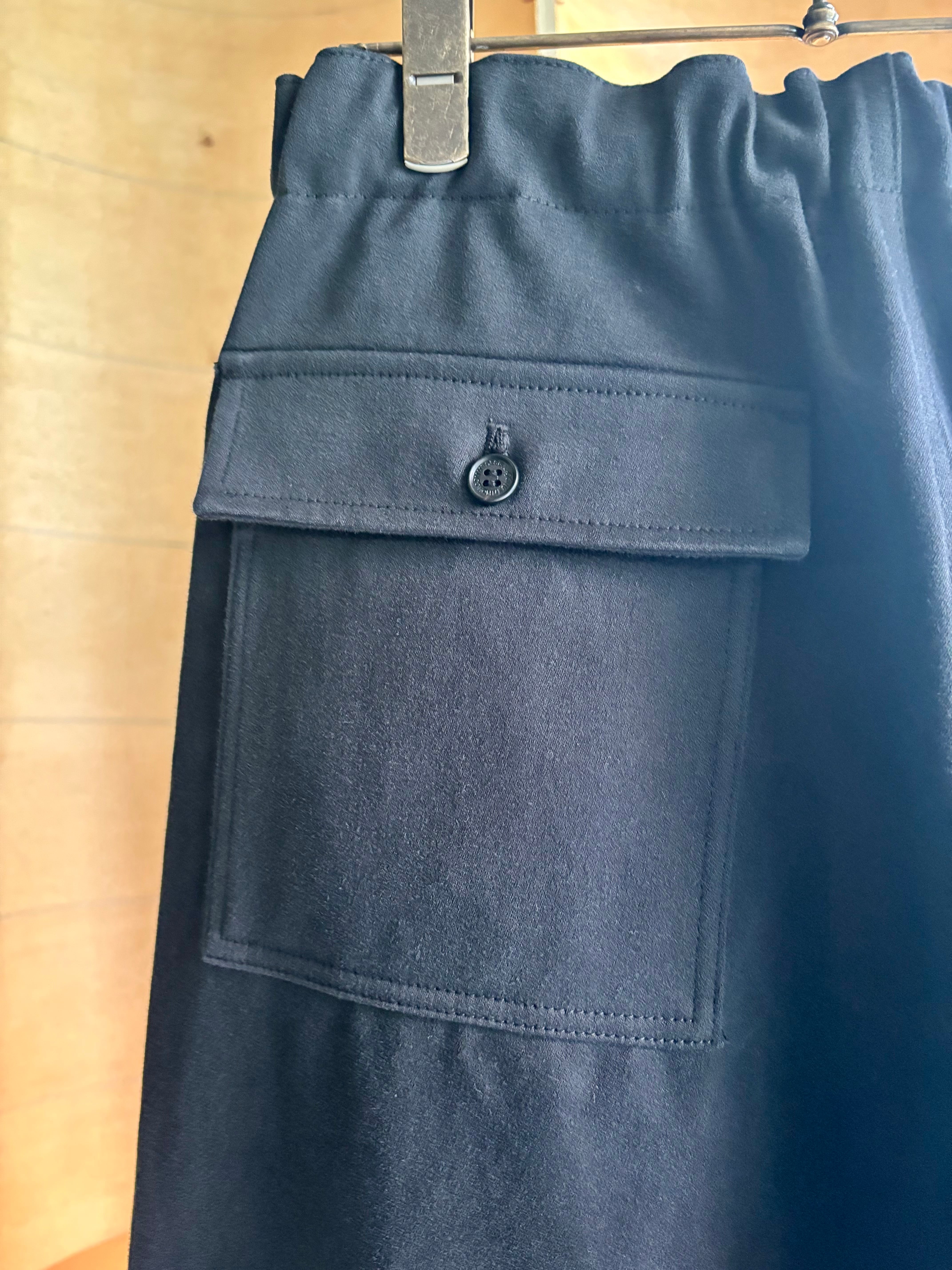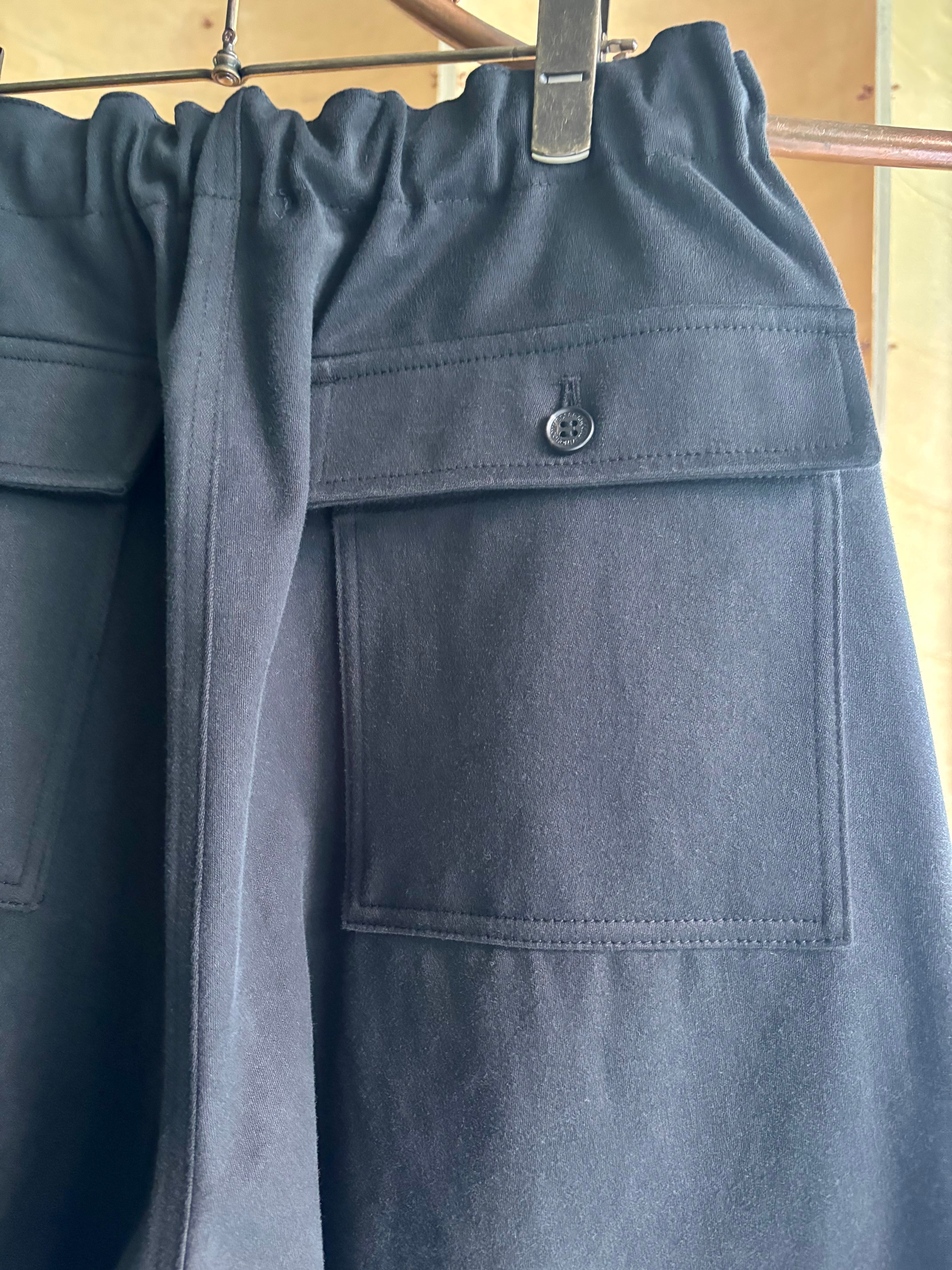 更に膝部分には立体的なシルエットを作り出すダーツやヒップにつけられた大きなフラップのついたパッチポケットや裾のドローコードなど、ミリタリーパンツのディテールがMIXされているのも特徴です。