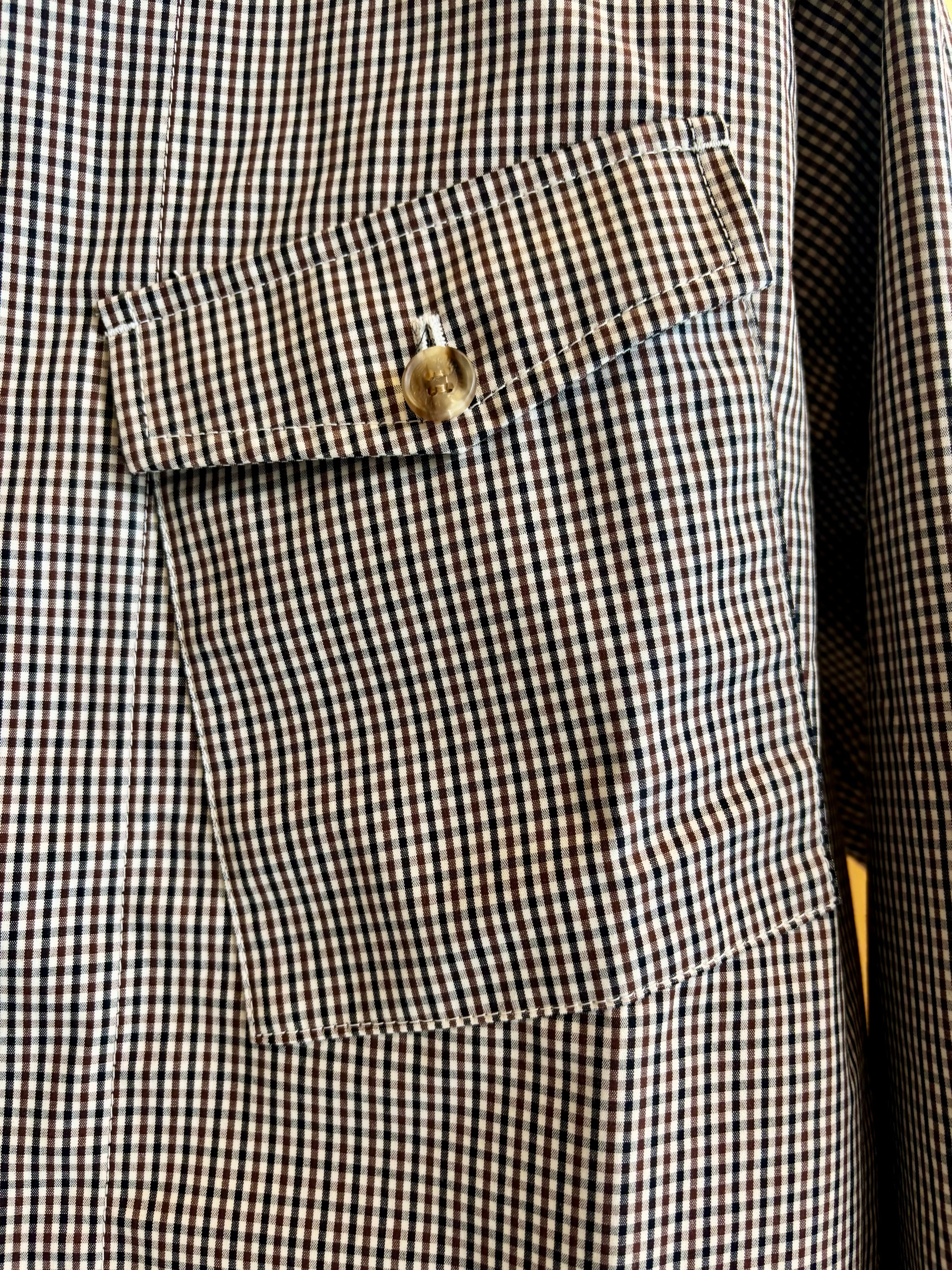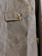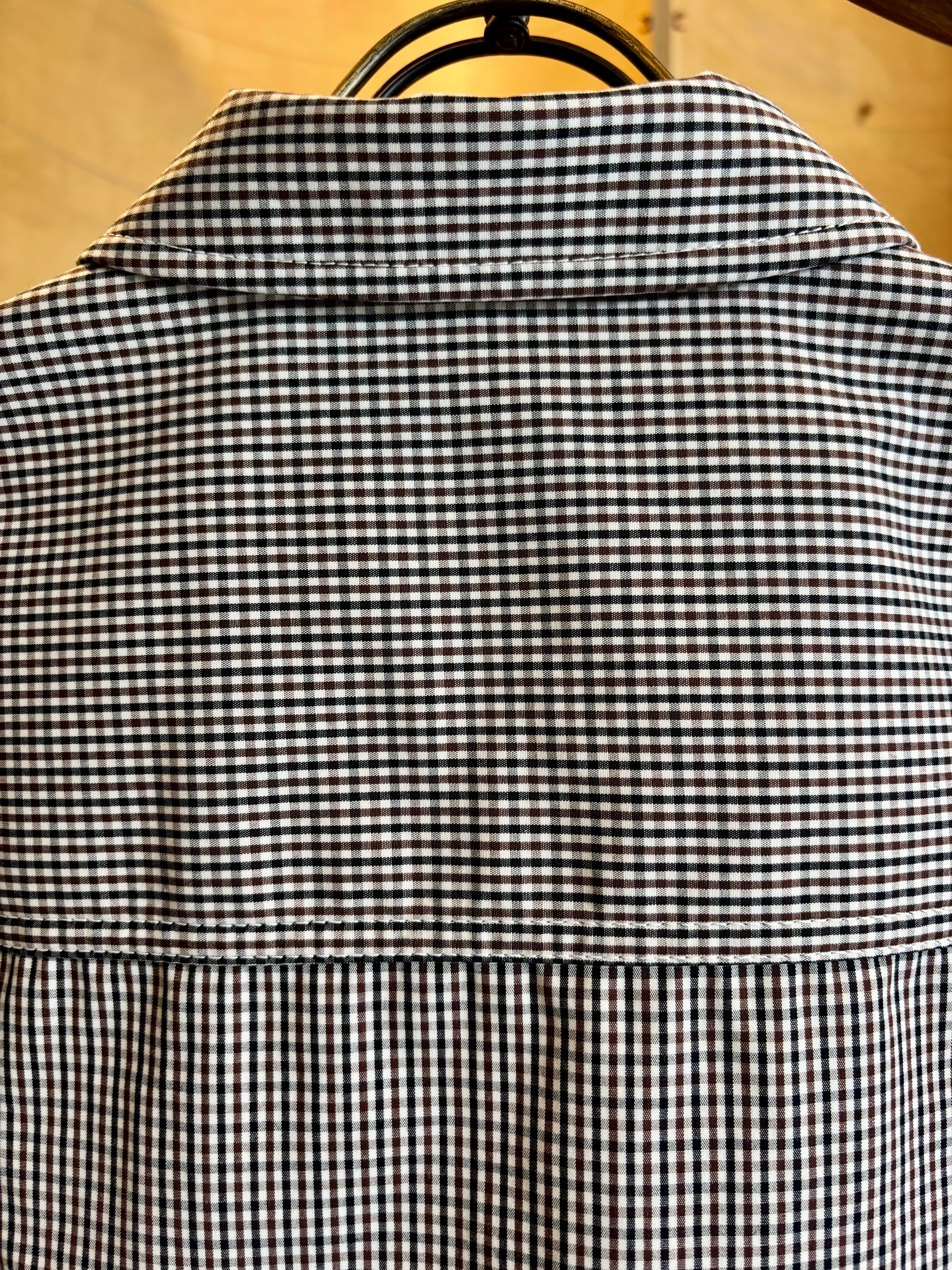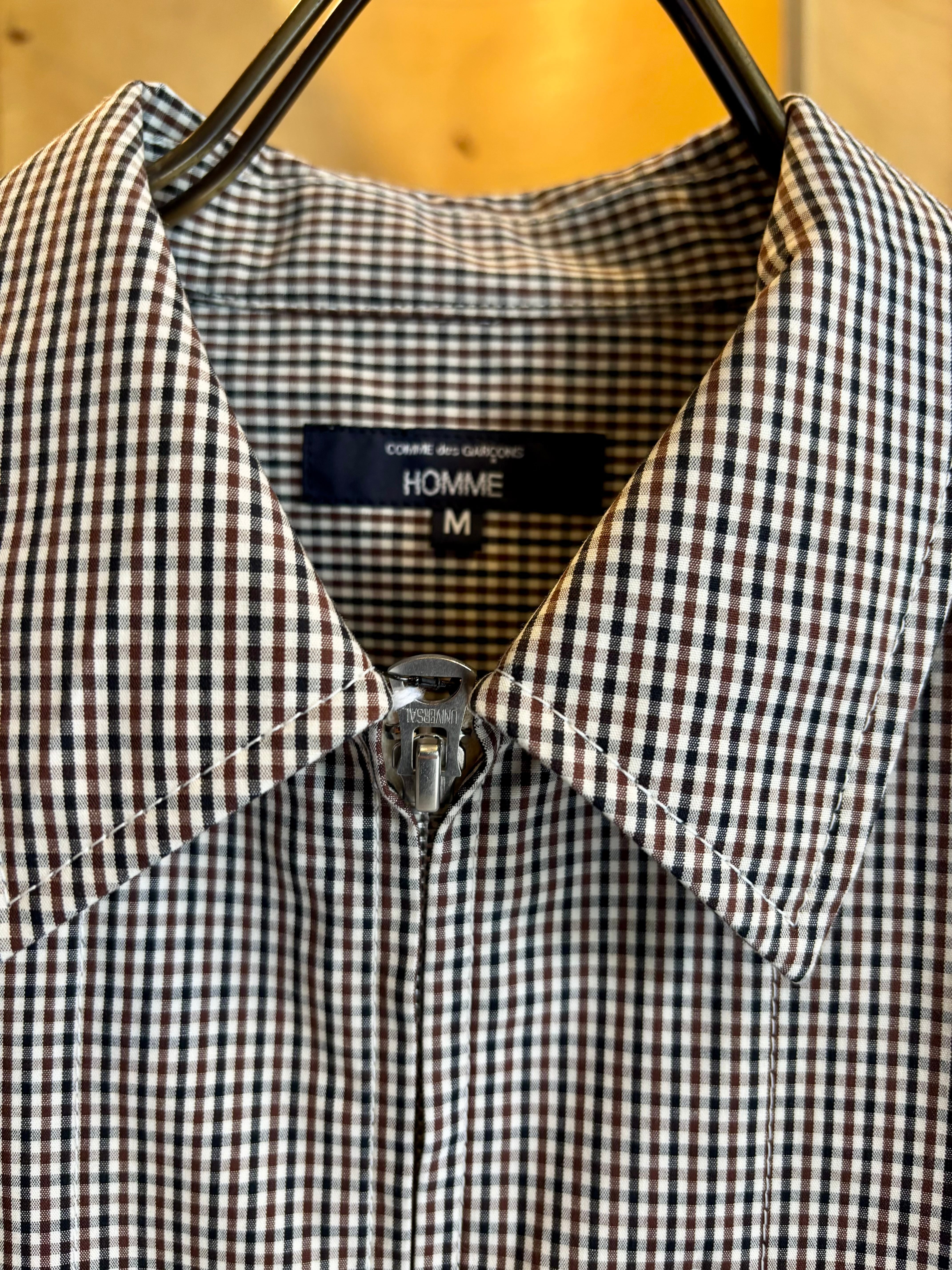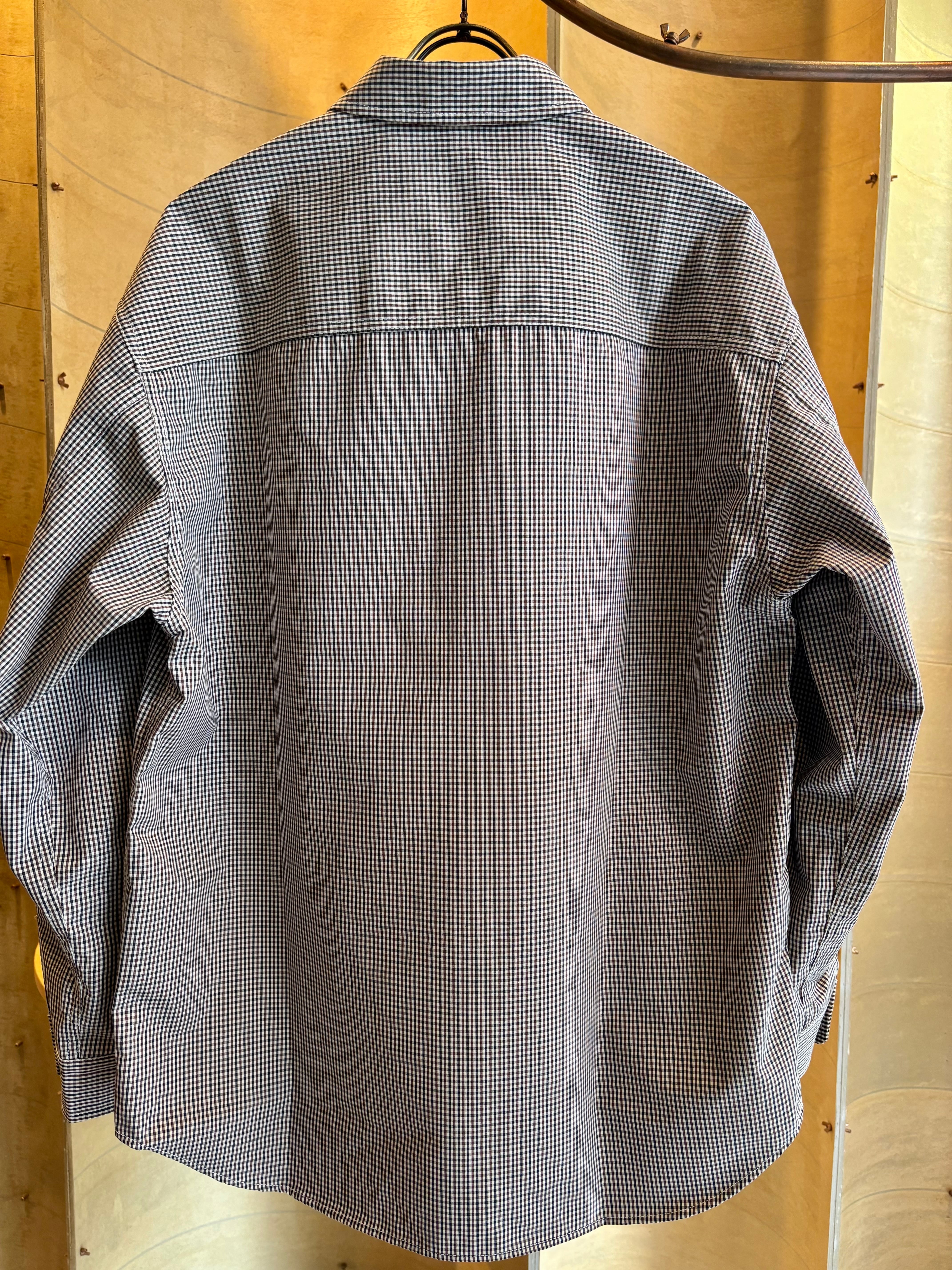 フロントがジップタイプになったシャツは素材にコットン3層レイヤー生地を使用した一枚。表地のコットンと裏地のコットンの間に防水性と透湿性のあるフィルムを挟んだ3層構造の生地を使用する事でコットンのラフな感じでありながらも機能的な素材感に。また生地にはオフホワイト×ブラック×ブラウンによる珍しい色合わせのチェックを使用。胸元に斜めに配されたフラップ付きのポケットなどひねりの利いたディテール使いも特徴です。