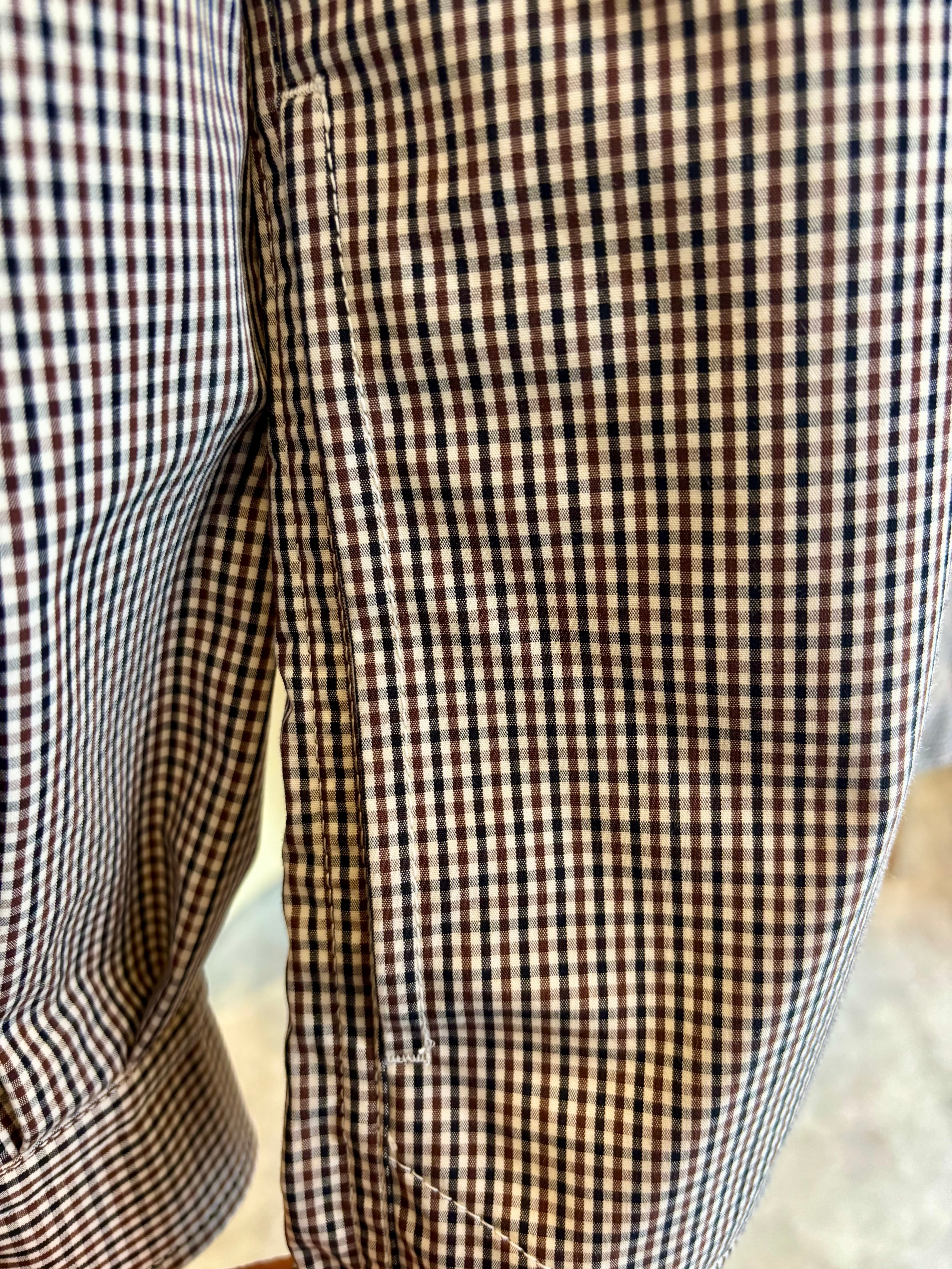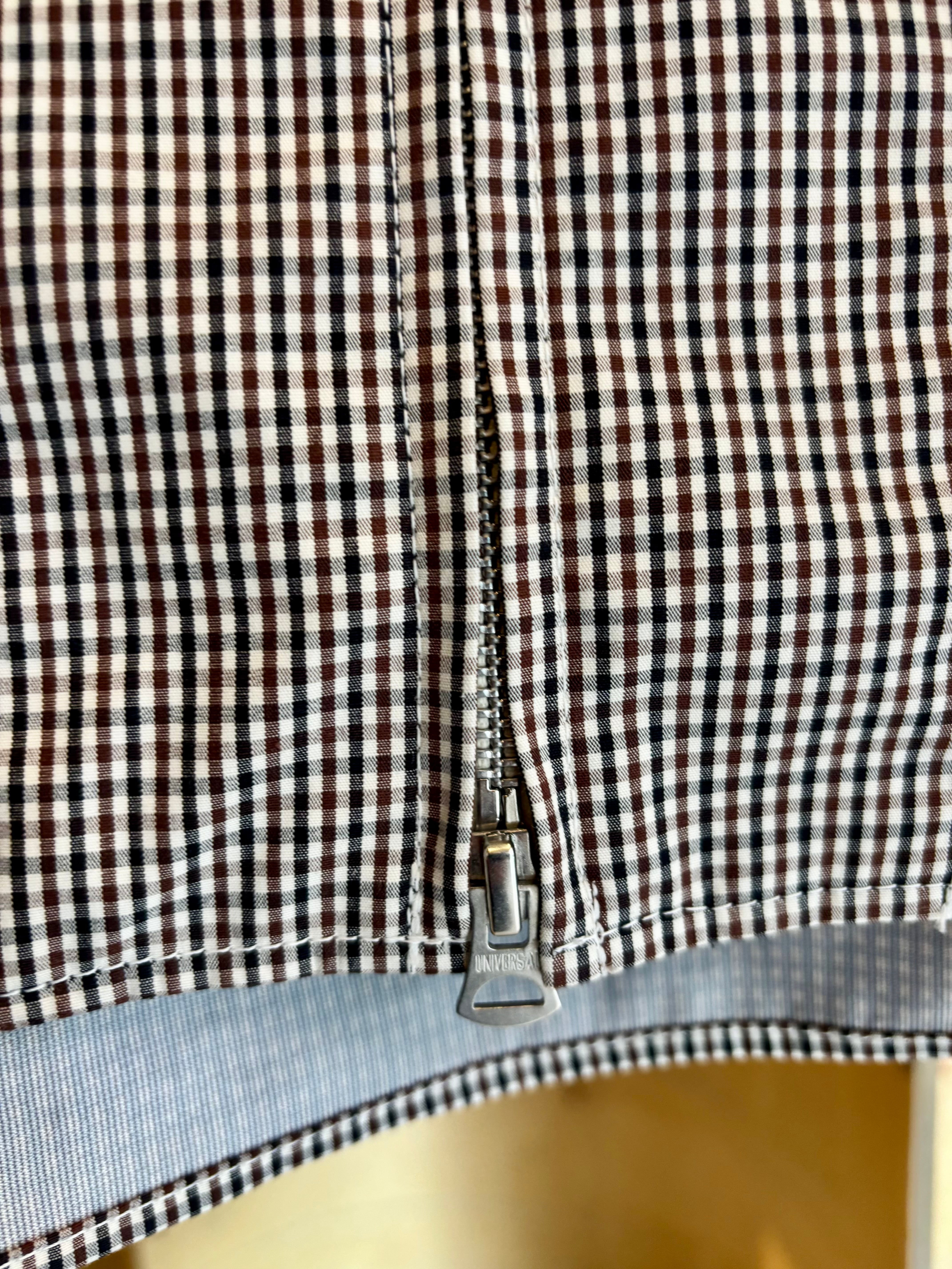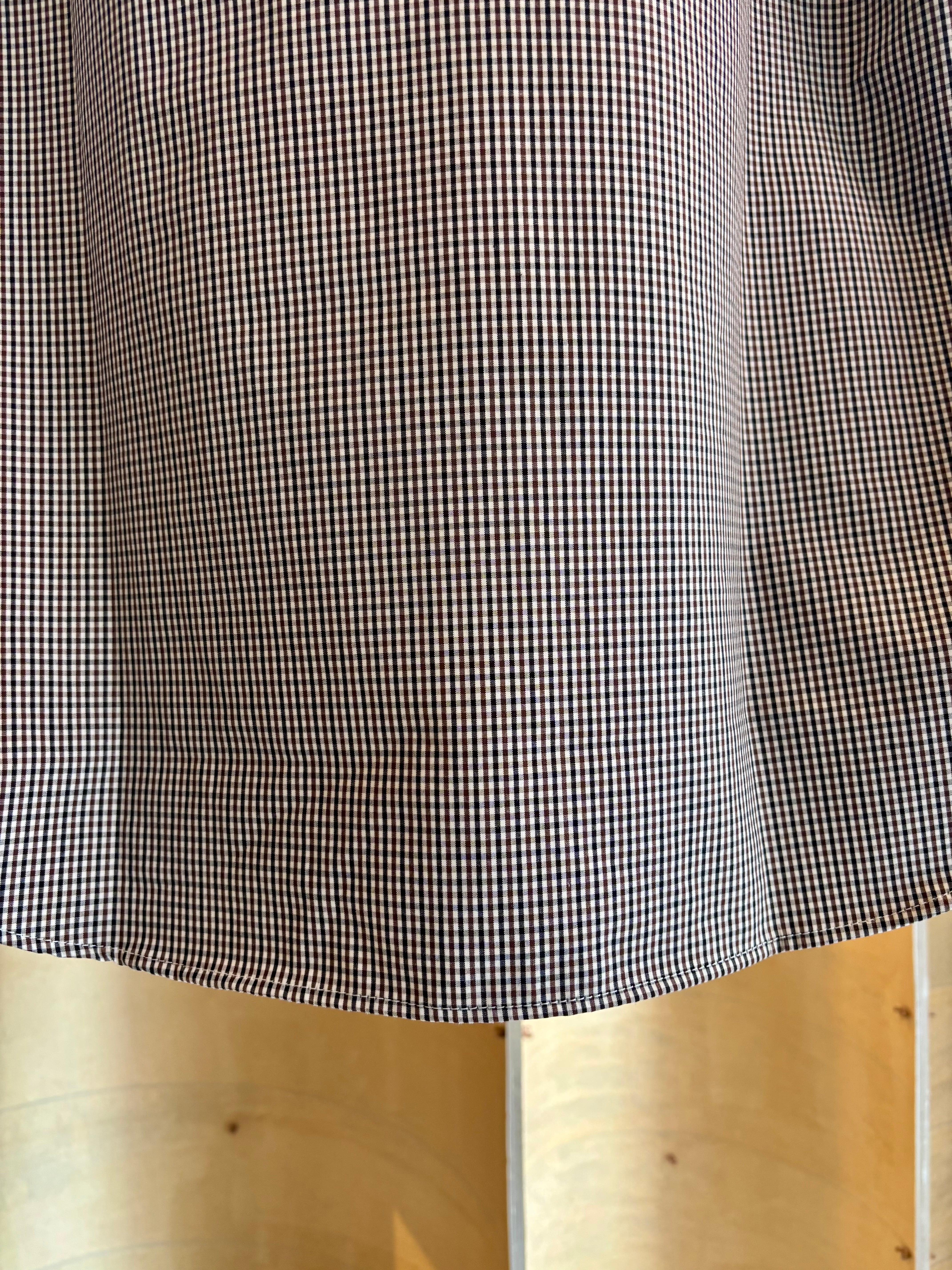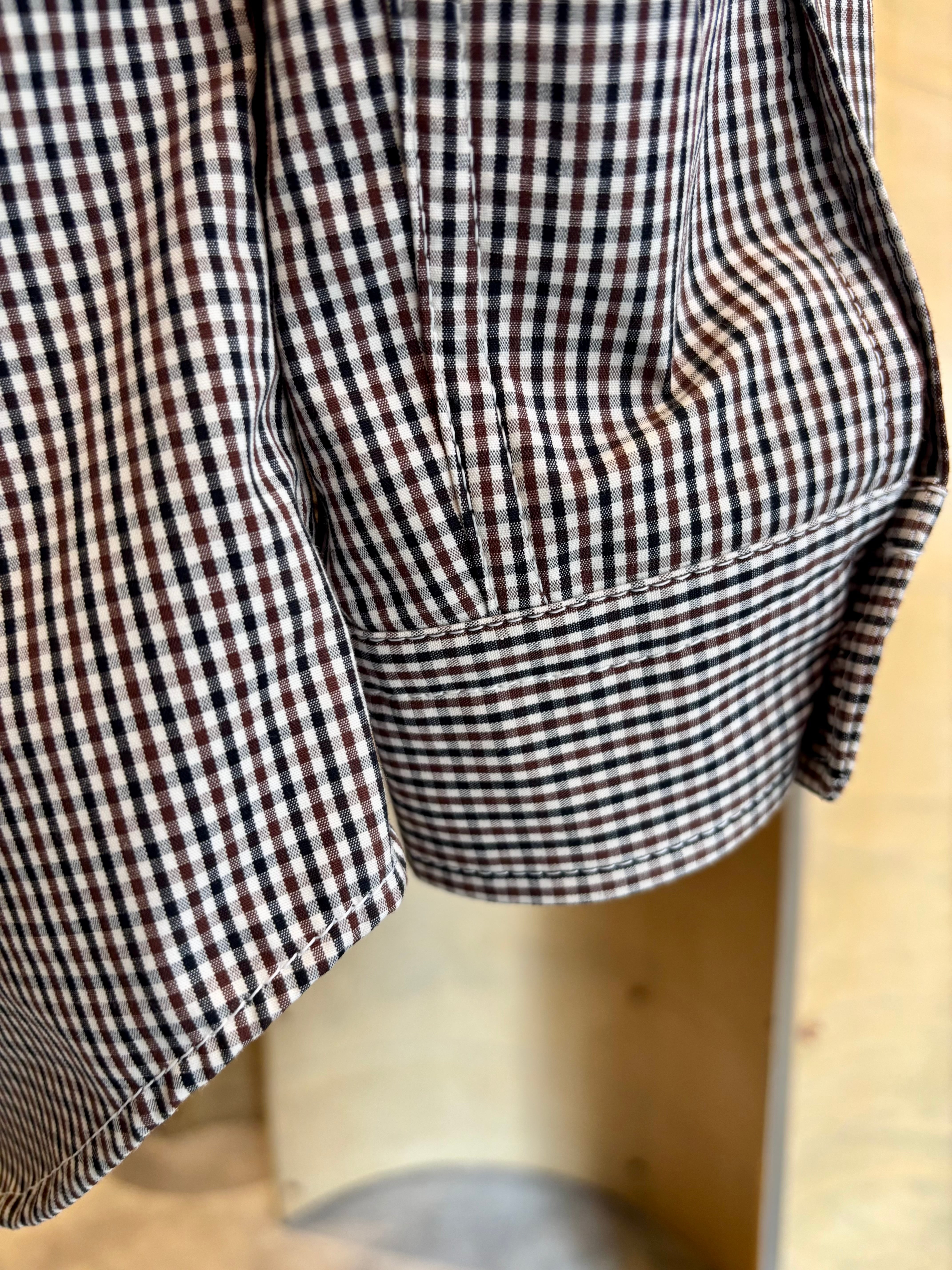 フロントがジップタイプになったシャツは素材にコットン3層レイヤー生地を使用した一枚。表地のコットンと裏地のコットンの間に防水性と透湿性のあるフィルムを挟んだ3層構造の生地を使用する事でコットンのラフな感じでありながらも機能的な素材感に。また生地にはオフホワイト×ブラック×ブラウンによる珍しい色合わせのチェックを使用。胸元に斜めに配されたフラップ付きのポケットなどひねりの利いたディテール使いも特徴です。