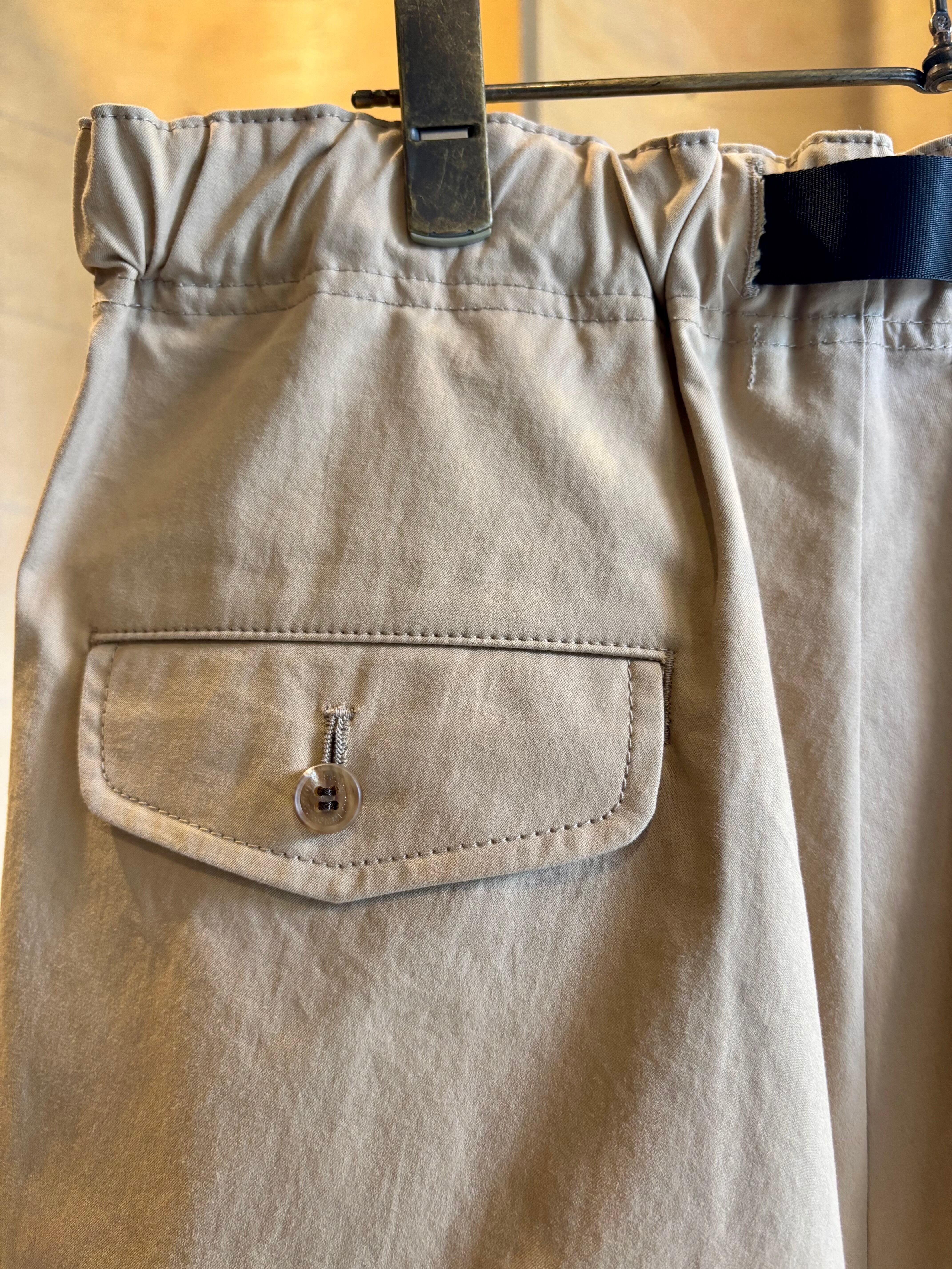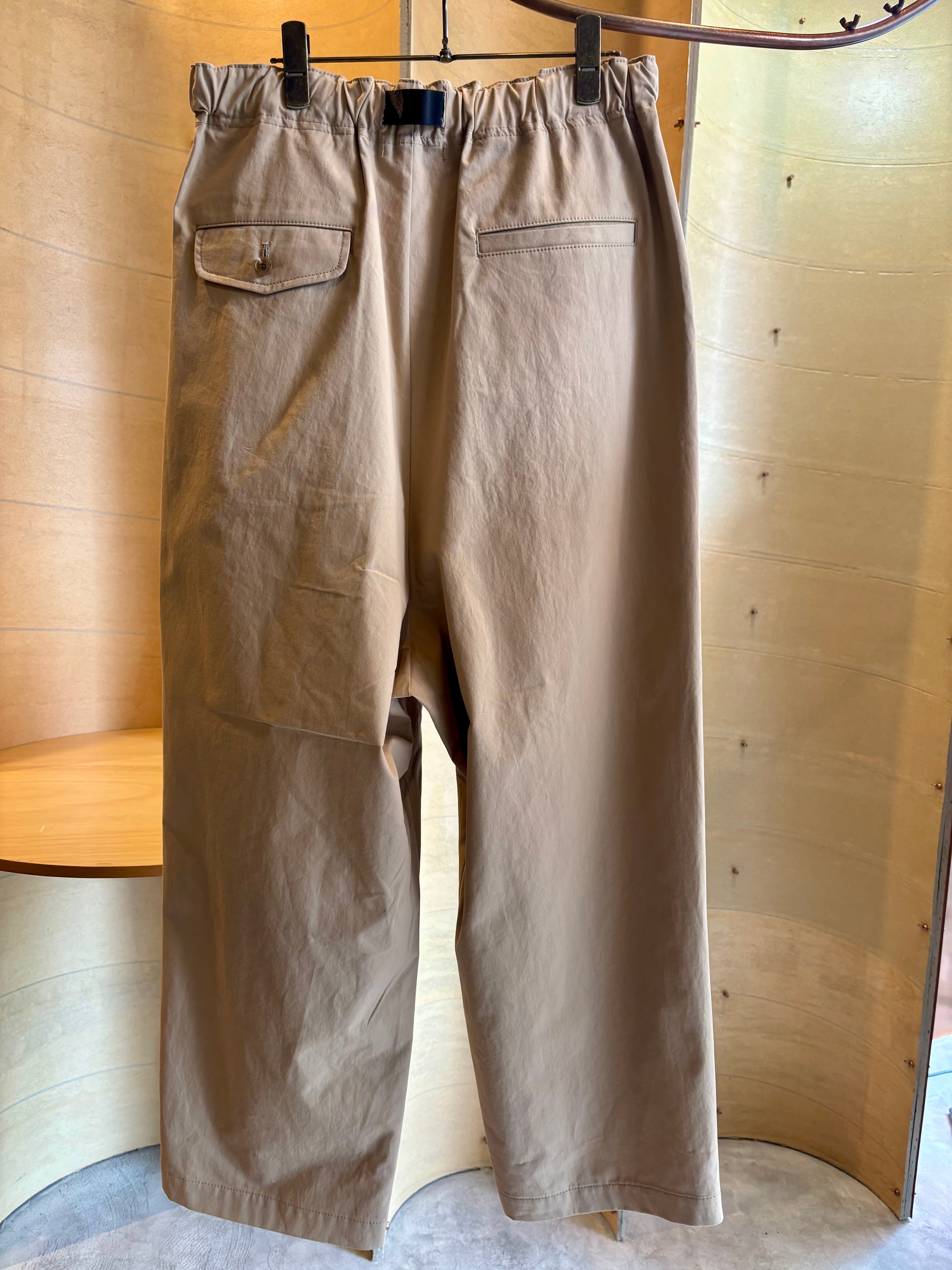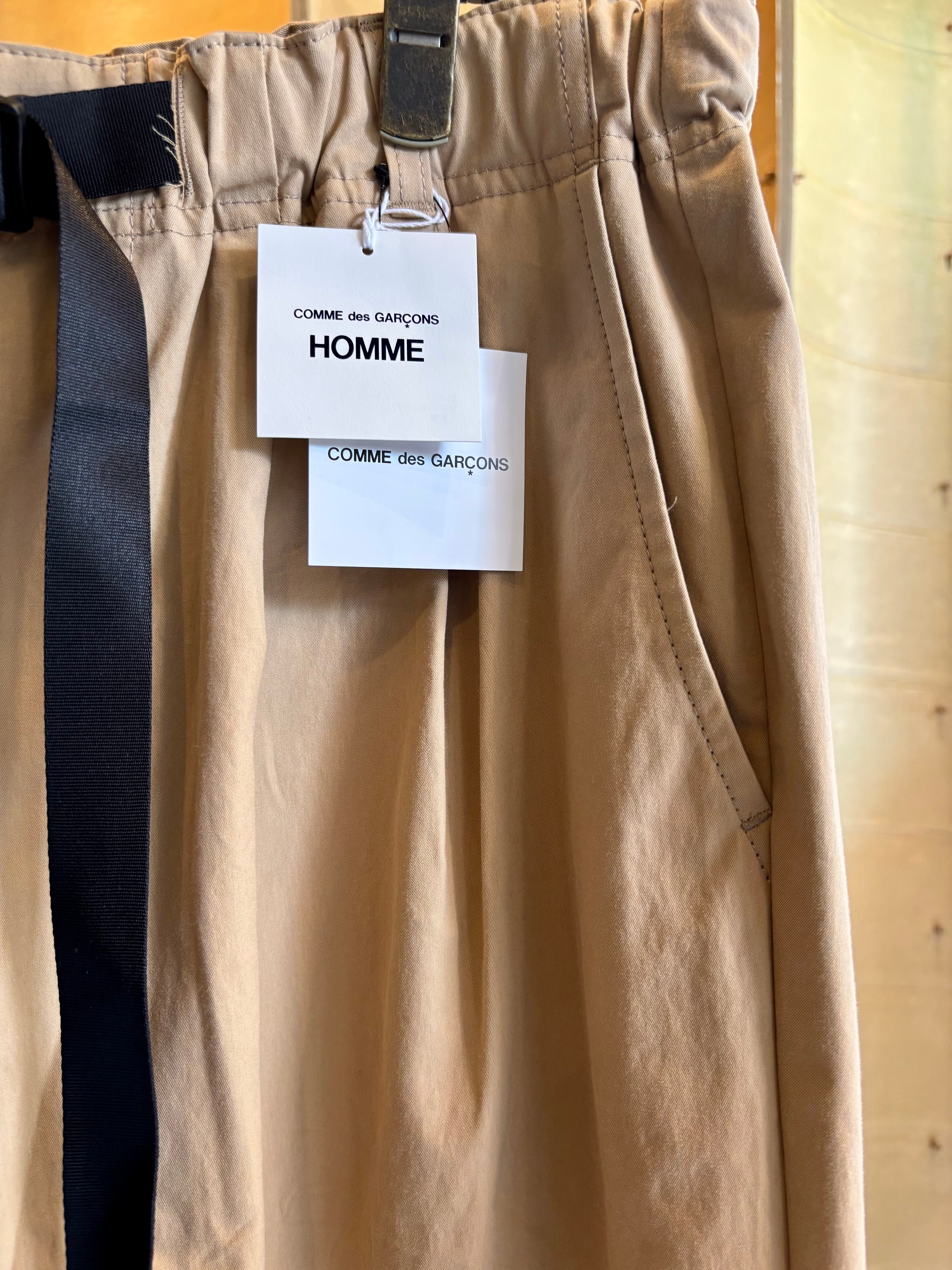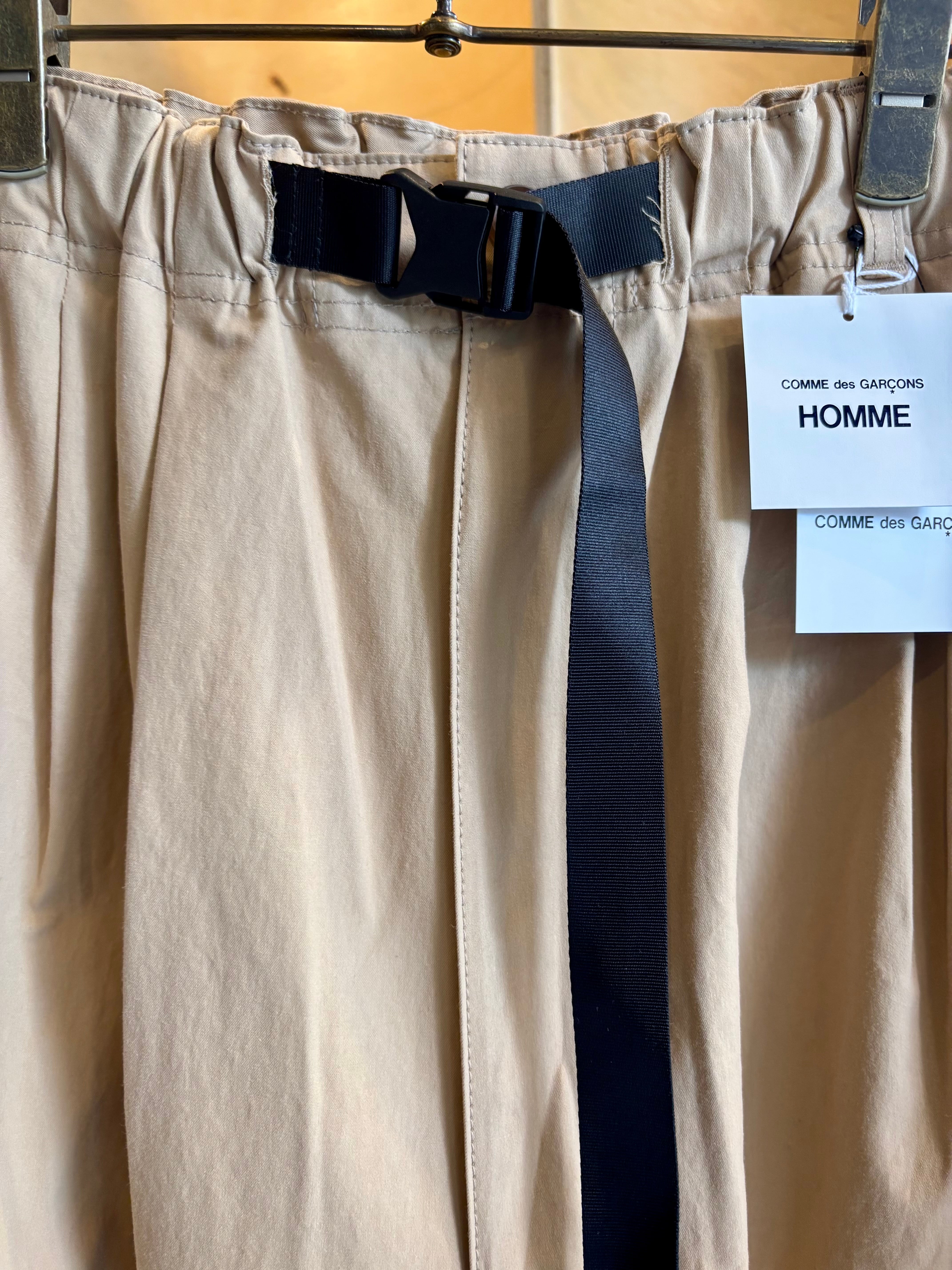 ウエストに入った3本のタックが特徴的なパンツシワになりにくく肌触りの良い素材感が特徴なるコットンツイルを生地に使用。ゆったりと深めの股上によるウエスト周りから、裾にかけて緩やかなテーパードを加える事で丸みがある独特なバランスでありながらもスッキリとしたシルエットを生み出します。またウエスト部分にはコードタイプのベルトをプラス。アウトドアのクライミングパンツをイメージさせるデザインでありながらもコム デ ギャルソン・オムらしいモード感をプラスさせながらもカジュアルに落とし込んだオリジナルな一本です。