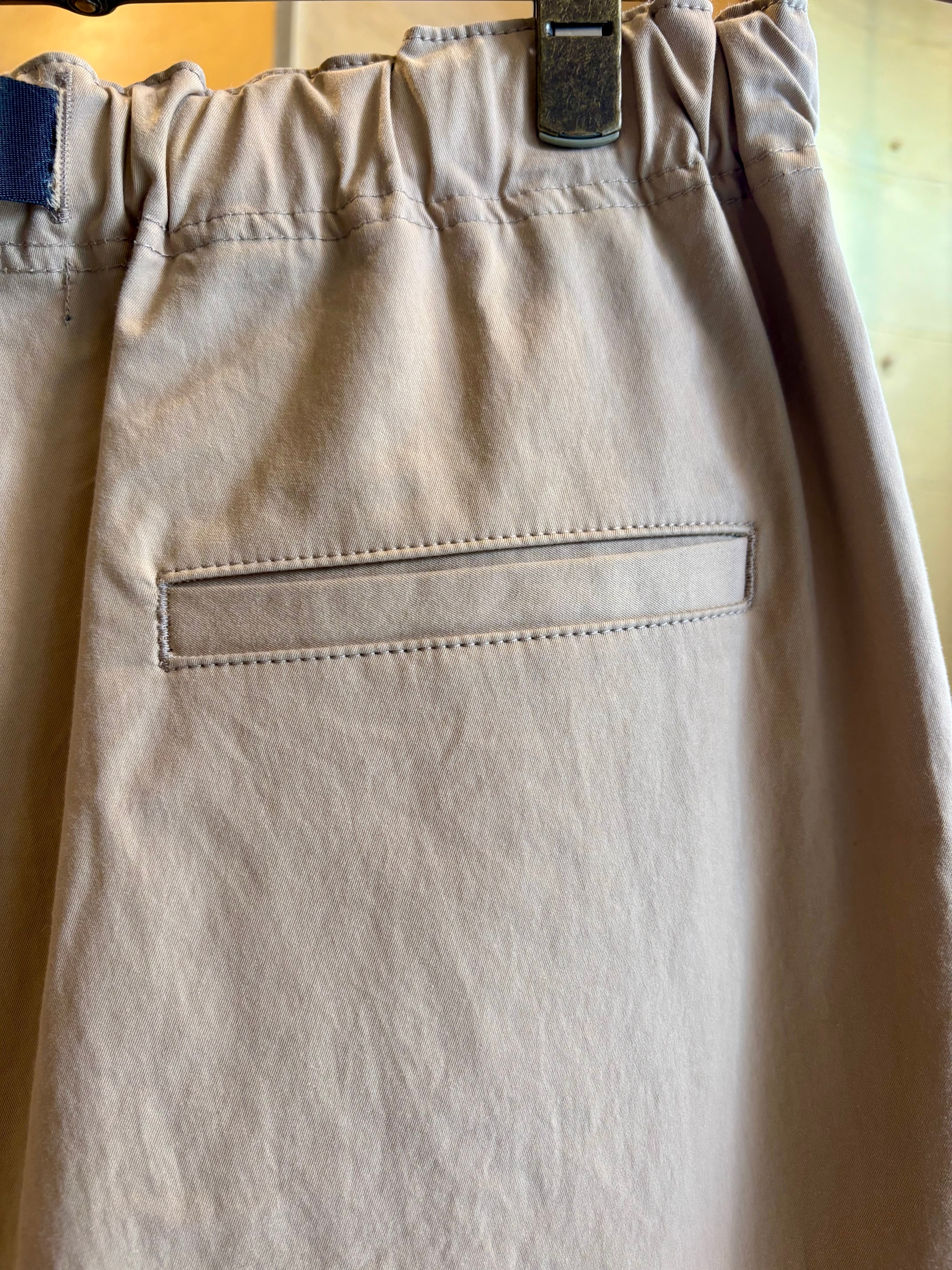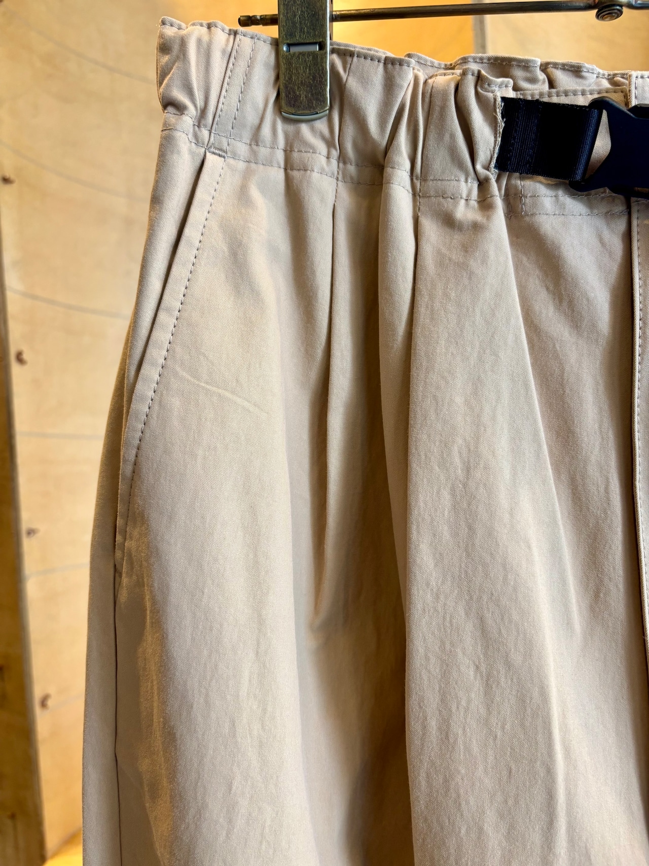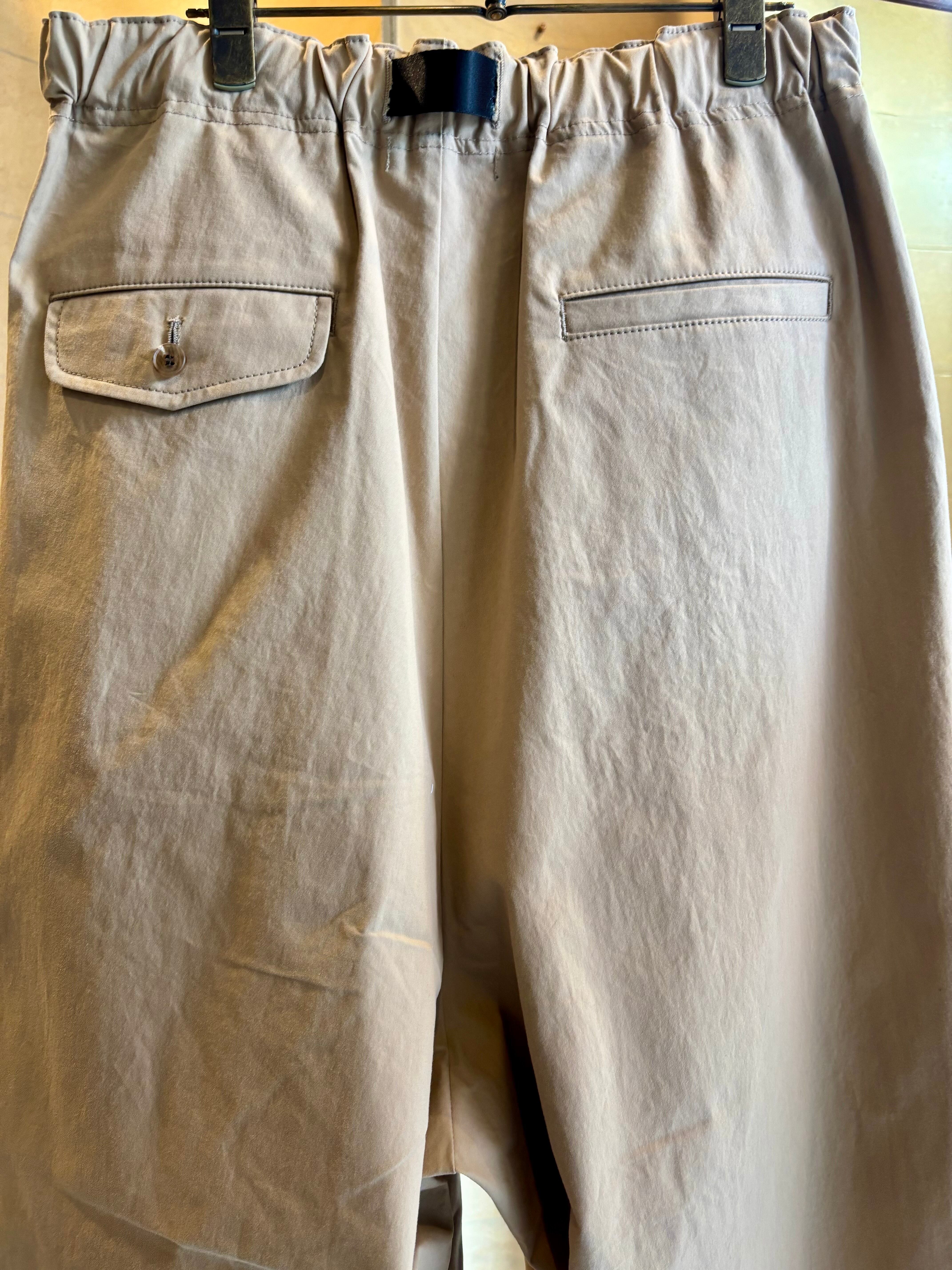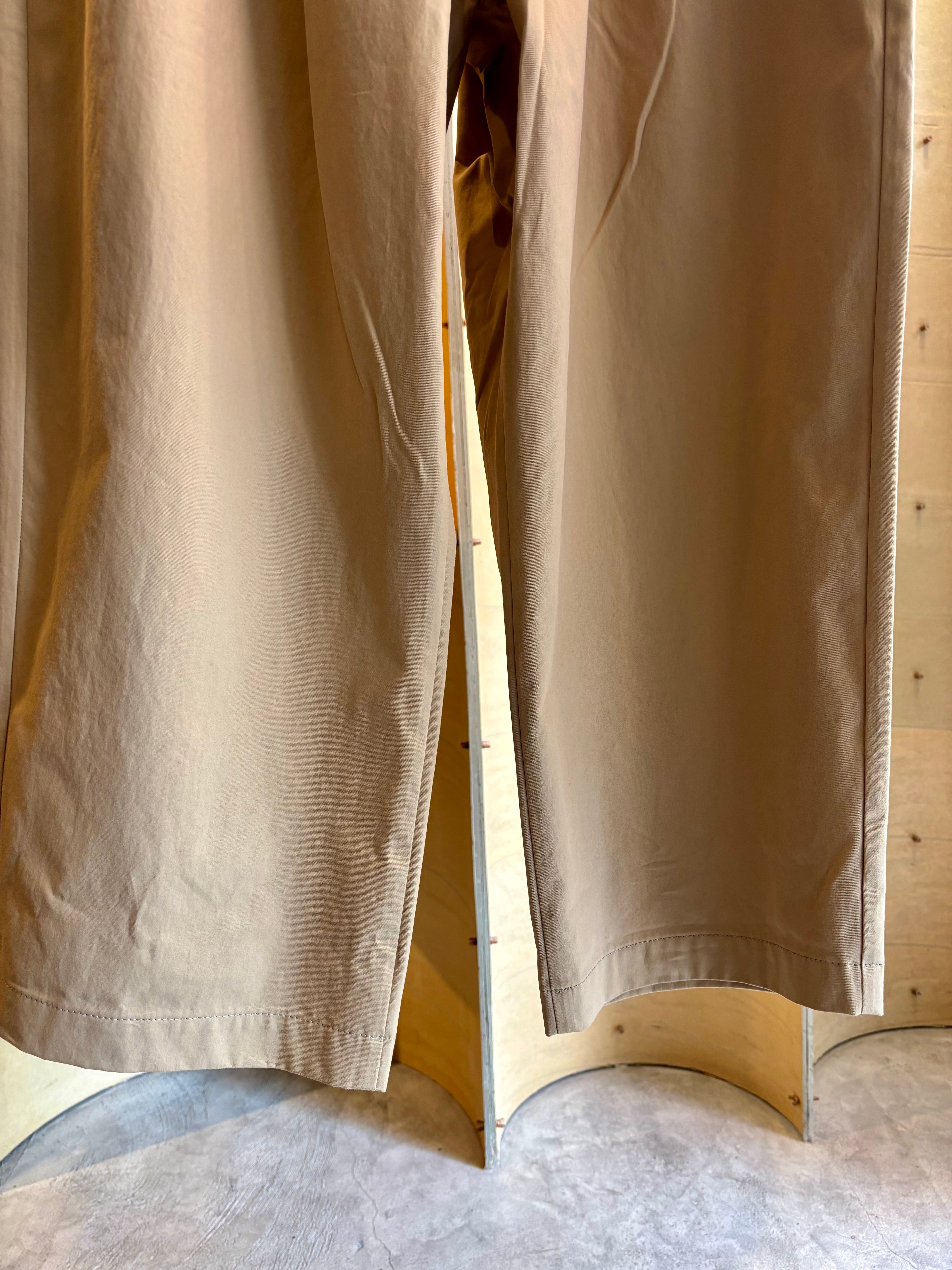 ウエストに入った3本のタックが特徴的なパンツシワになりにくく肌触りの良い素材感が特徴なるコットンツイルを生地に使用。ゆったりと深めの股上によるウエスト周りから、裾にかけて緩やかなテーパードを加える事で丸みがある独特なバランスでありながらもスッキリとしたシルエットを生み出します。またウエスト部分にはコードタイプのベルトをプラス。アウトドアのクライミングパンツをイメージさせるデザインでありながらもコム デ ギャルソン・オムらしいモード感をプラスさせながらもカジュアルに落とし込んだオリジナルな一本です。