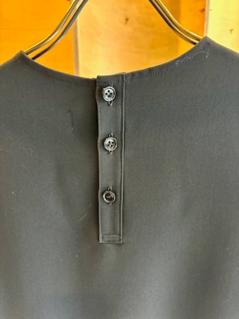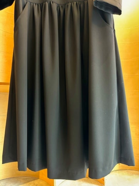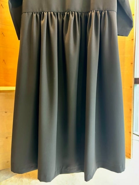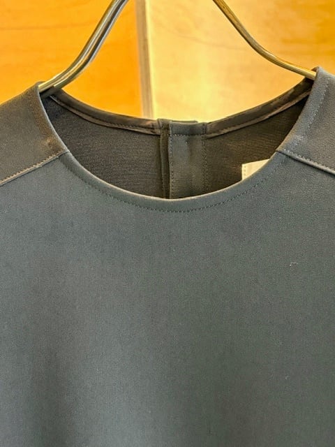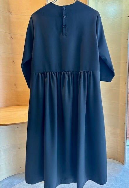 襟ぐりはすっきりとしたクルーネックウエスト位置でギャザーで切り替えがあり